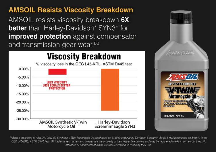AMSOIL 20W-50 Synthetic V-Twin Motorcycle Oil resists viscosity breakdown 6X better that Harley-Davidson SYN3 Oil.*